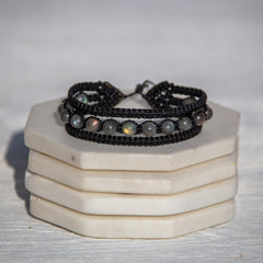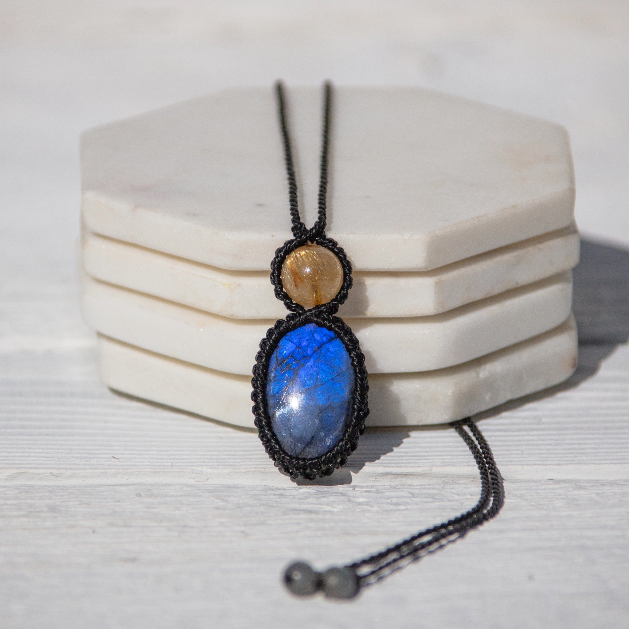 The combination of Labradorite - "The Temple of the Stars" & Rutilated Quartz - "The Illuminator" offers a powerful alliance that supports the wearer with spiritual transformation and deep personal growth, amplified intuition and higher wisdom, mental clarity and meditation, energetic cleansing and protection.