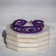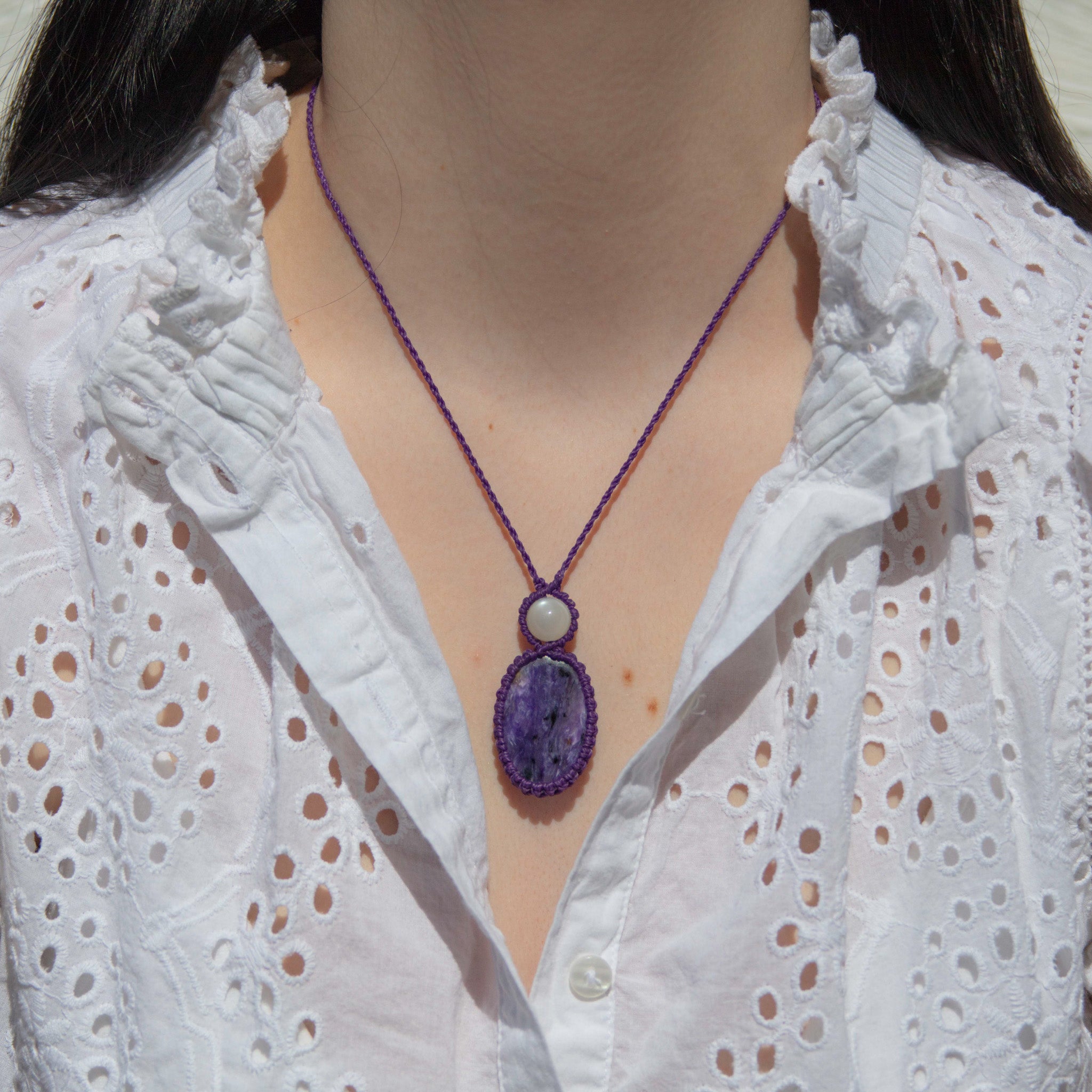 The combination of Charoite - "The Transformer" & White Moonstone - "The Full Moon" offers a powerful alliance that supports the wearer with connection to higher realms, enhanced divine alignment, empowered spiritual transformation and intuition, emotional healing and self-acceptance.