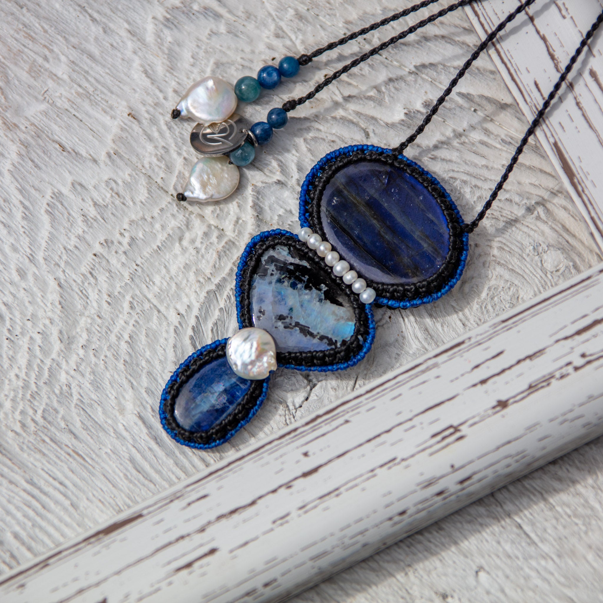 The stones featured in this piece are Labradorite - "The Temple of the Stars", Rainbow Moonstone with Tourmaline - "Evoking the Goddess", Kyanite - "The Bridge"Pearls - "Signifying Innocence". Spiritually their partnership creates a healing energy that support the wearer with a potent fusion of intuitive awakening, energetic protection, mental clarity, and emotional harmony. These stunning, inimitable necklaces are as unique as you are. When you wear an Accomplices necklace, you remind yourself and the world around you, that you have a place at the table. Pair with your favorite Bling Bijou or Earthy Embrace bracelets and feel the deep, positive and loving intentions of Susana’s jewelry.