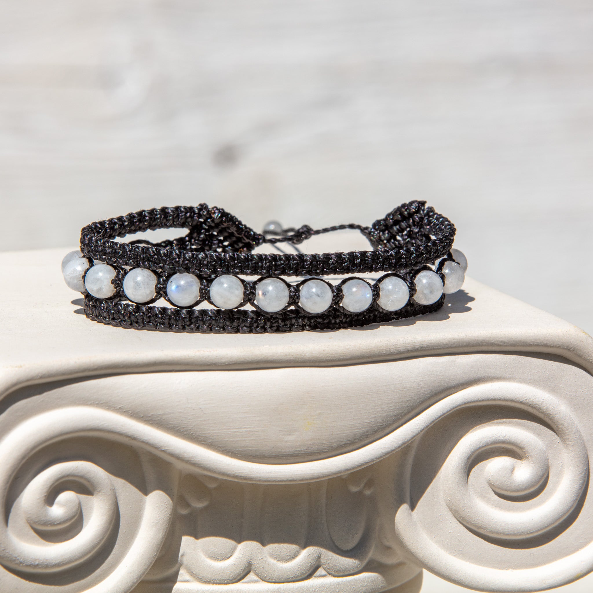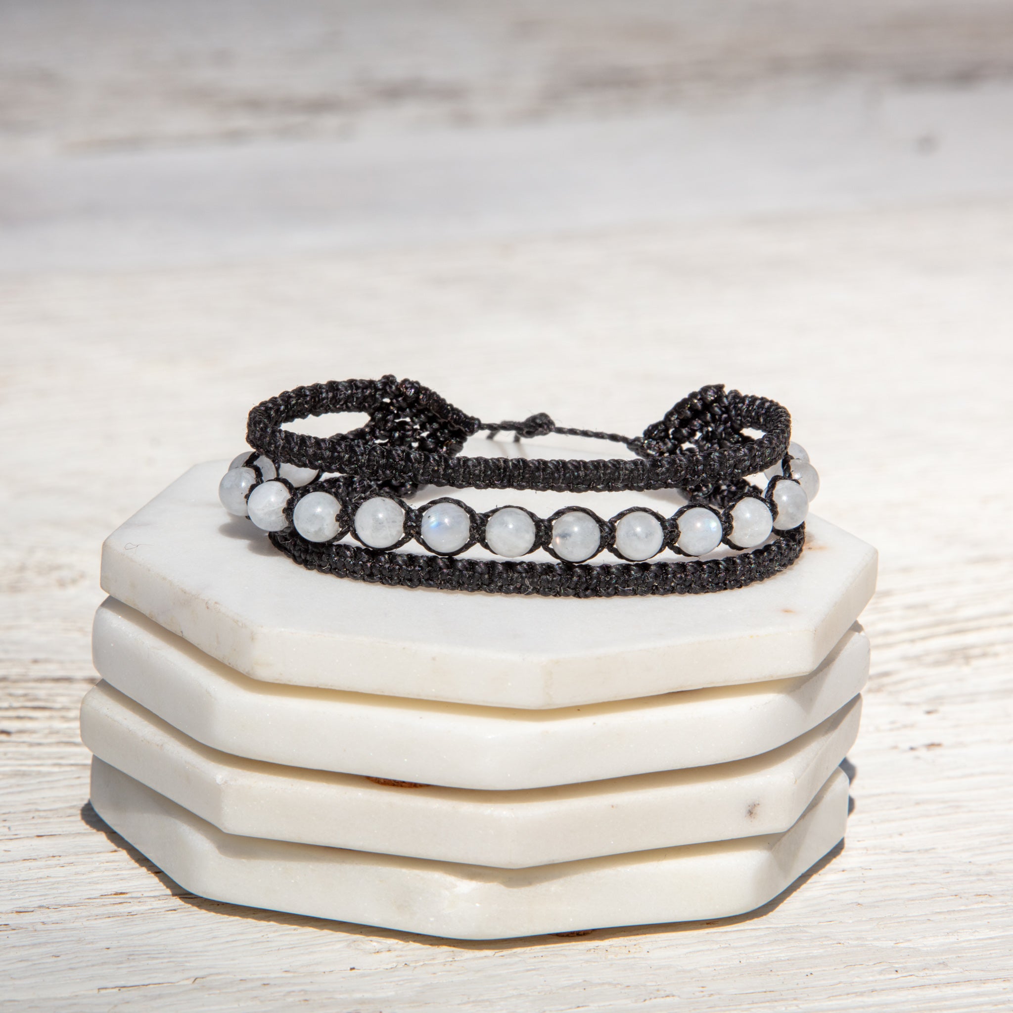 This Earthy Embrace features Rainbow Moonstone - "The Goddess of Destiny". This gemstone is known for it’s vibrant, multicolored rainbow-like iridescence in white. Spiritually this divine crystal is known to support us with self discovery, emotional support, intuition and tenderness. These healing bracelets offer a sense of connection to the divine feminine energies to the wearer.