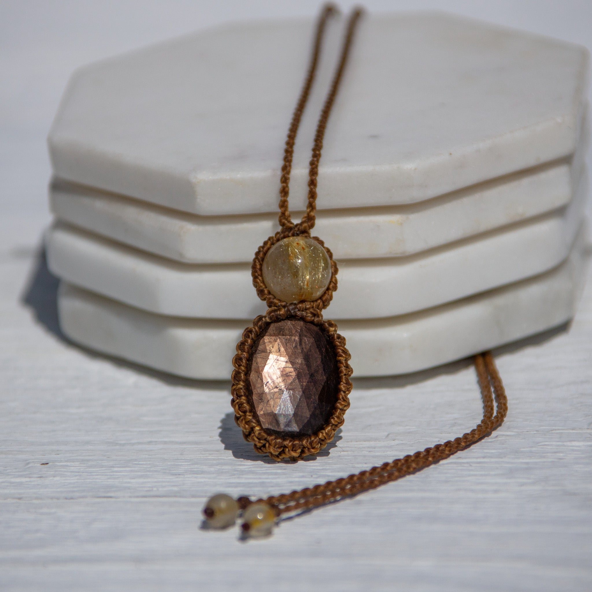 Our jewelries are made with responsibly sourced gemstones from all over the World. Every piece is intertwined with Brazilian Settanyl waxed cord, a material highly appreciated in the art world for its durability, excellent colorfastness and versatility.